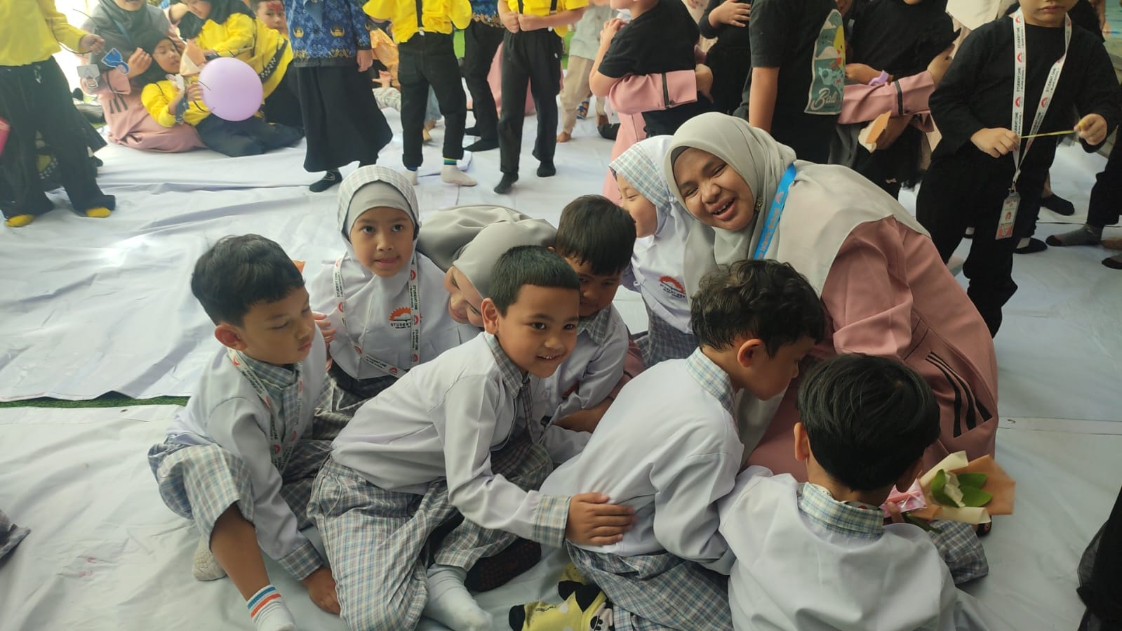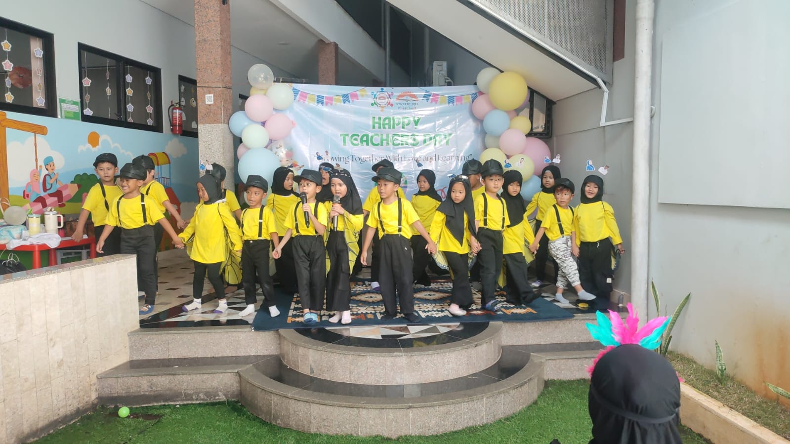 Di unit TK peringatan berlangsung di lapangan bermain. Panggung mungil sudah ditata rapi dan meriah oleh SPC.